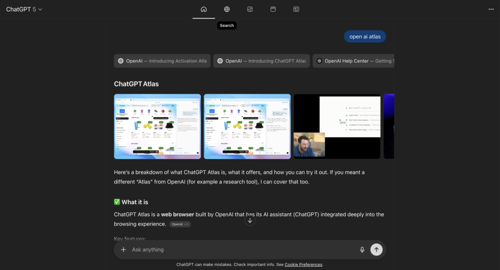 If you type a question or a keyword, Atlas will not only give you the standard search results, but also an instant answer or explanation from ChatGPT. You’ll also see tabs for Search, Images, Videos, and News – these let you filter results just like on a search engine.