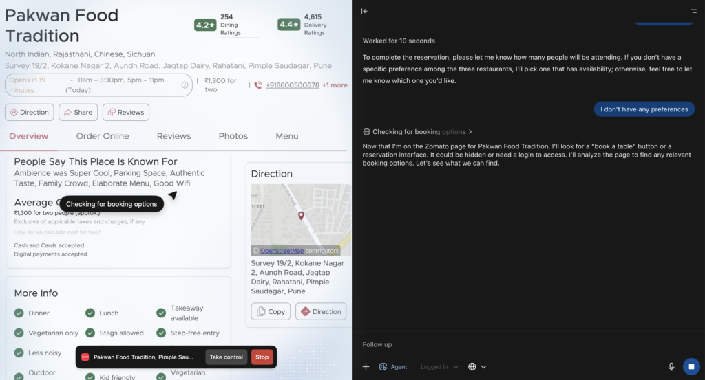 Moreover, you can see the AI doing its work in real time. It opens tabs, scrolls through pages, and interacts with sites while explaining its progress in the chat window. You can stop it anytime, take control, or tell it to continue.