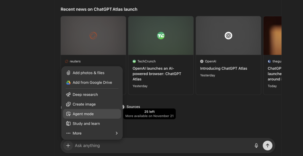 In Agent Mode, Atlas doesn’t just answer your questions. It can actually browse, click, type, and complete tasks just like a person would. You can think of it as giving your browser a brain and a pair of hands. It can reason, plan steps, take actions, and even check its own work before moving to the next step.