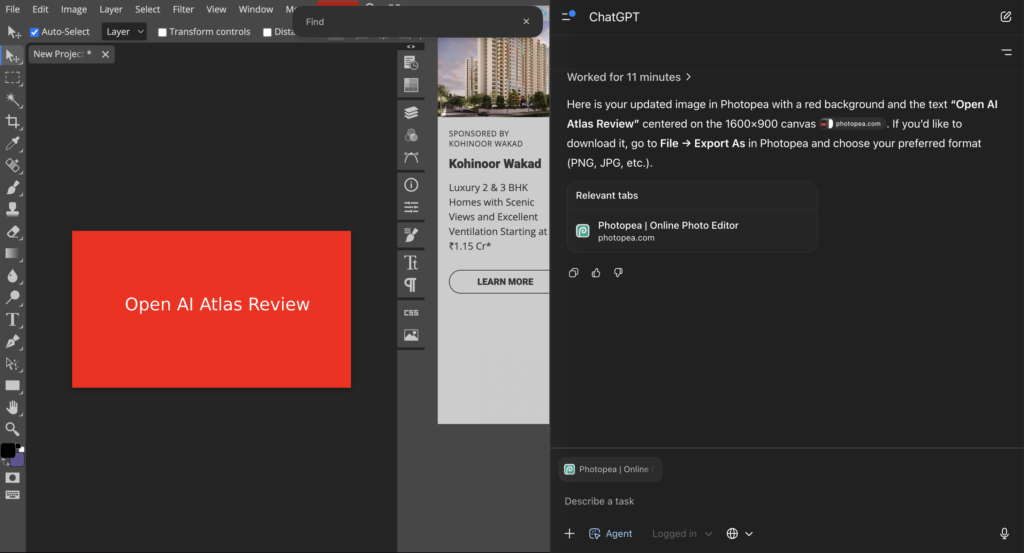 Finally, I tested its ability to use creative tools. I told Atlas to open Photopea and design a simple poster with a red color background and the text “Open AI Atlas Review.” It launched the editor, created a new project and added colors and text. However, when I tried giving it an image to edit, it couldn’t process it and failed to make the changes.